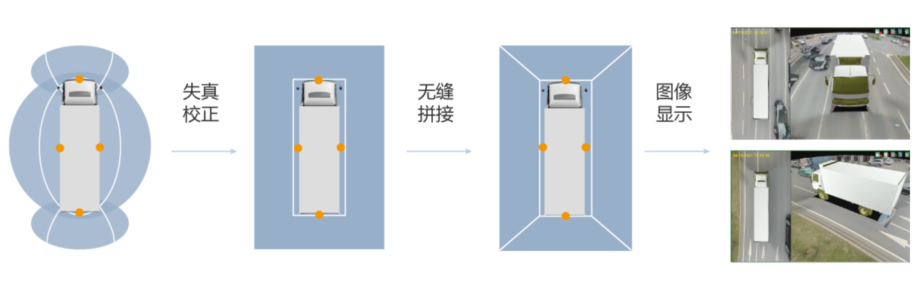 ● 4个超广角摄像头,实时采集四周的影像,实时无缝拼接形成一幅360°全景俯视图